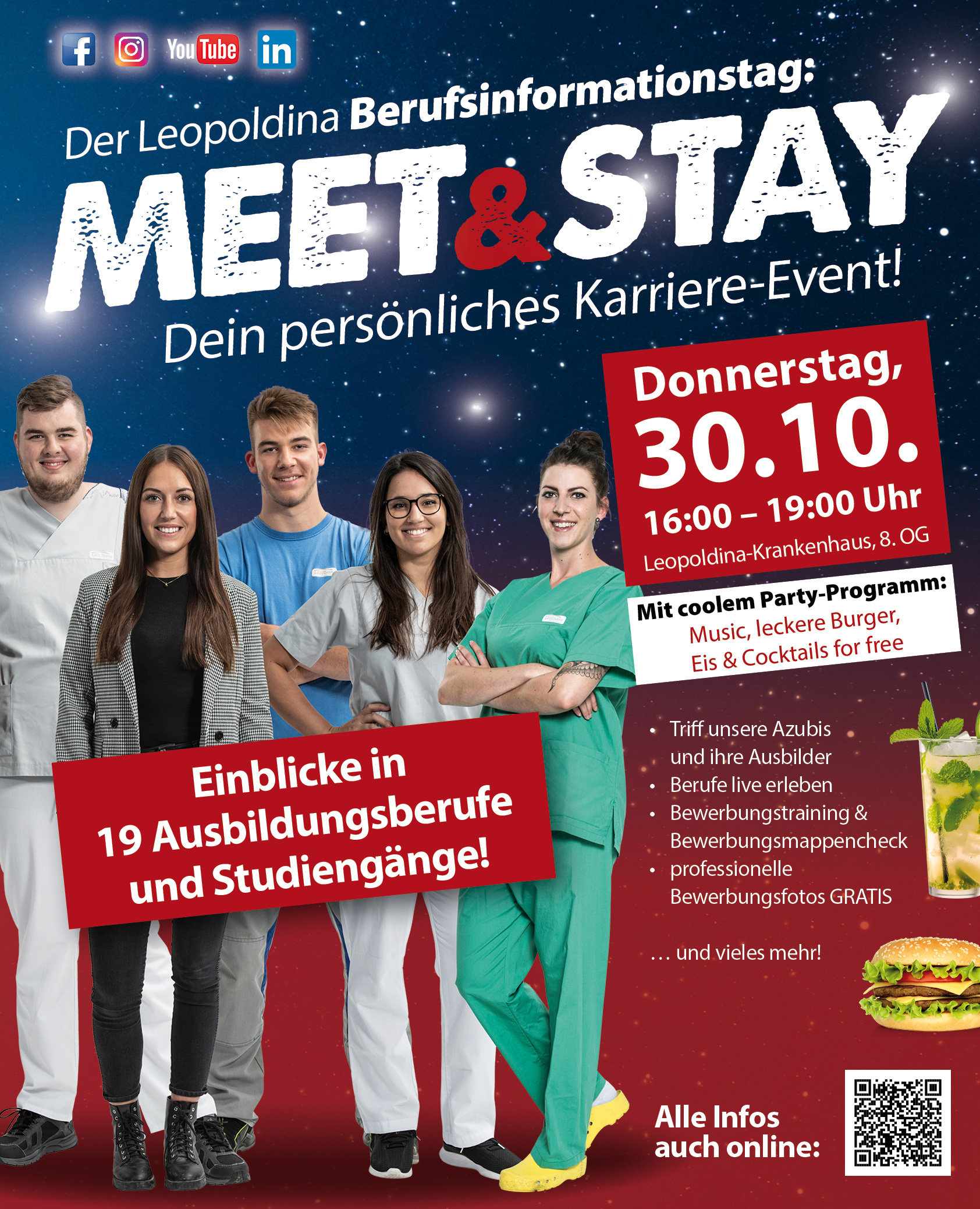 Insgesamt werden am Leopoldina-Krankenhaus 19 Ausbildungsberufe und Studienmöglichkeiten angeboten und zeigen damit, dass das Krankenhaus viel mehr zu bieten hat als nur gute Medizin. Zweimal im Jahr gibt das Leo auf seinem Berufsinformationstag „Meet&Stay“ künftigen Schulabgängerinnen und Schulabgängern hautnah Einblicke in die Berufe. Dabei stehen Auszubildende und Ausbilder Rede und Antwort. Abgerundet wird das Event durch ein attraktives Rahmenprogramm mit Musik, Burgern oder Pasta, Eis und Cocktails. Der nächste Meet&Stay findet am 30.10.25 ab 16.00 Uhr im 8. OG des Leopoldina statt.